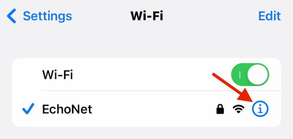 Now, tap on the Info button next to the WiFi network you're currently connected to.