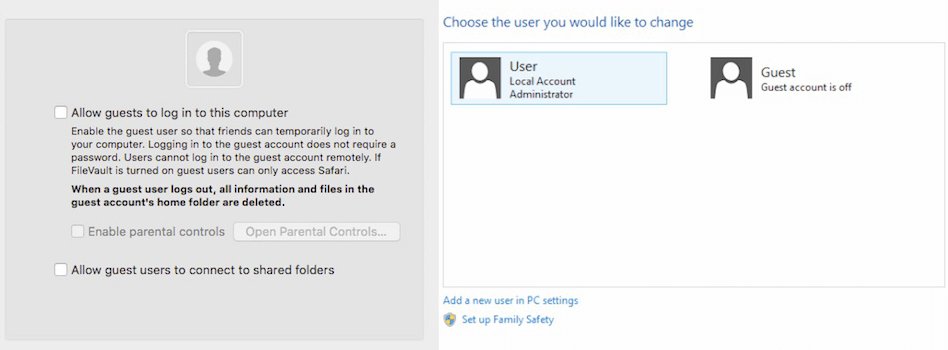 The safest way to allow other people to use your computer is to switch on the Guest user. This allows people to log into a separate account that is removed when they've finished so nothing they do online or download onto the computer is stored once they log out.