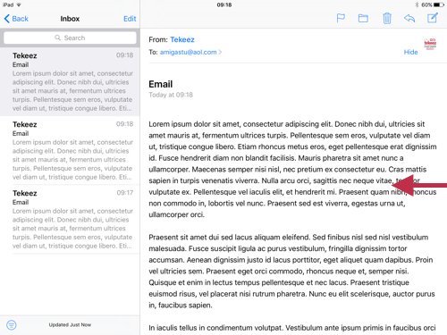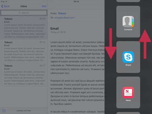 To start, open the first app that you want to use, in this example, we're using Mail. When your app is open, swipe in from just off the right hand side of the iPad screen.