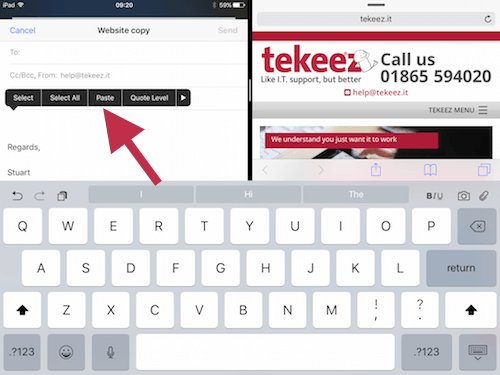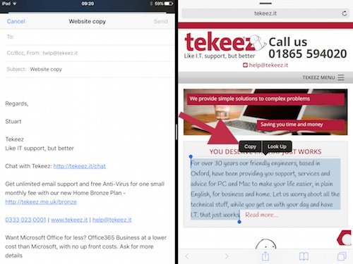 Both apps are now active and you can use them both at the same time. In this example, we're going to start a new email in Mail and then copy and paste some text from Safari on the right. All we need to do is start a new email as normal, then highlight the text from the website and copy it.