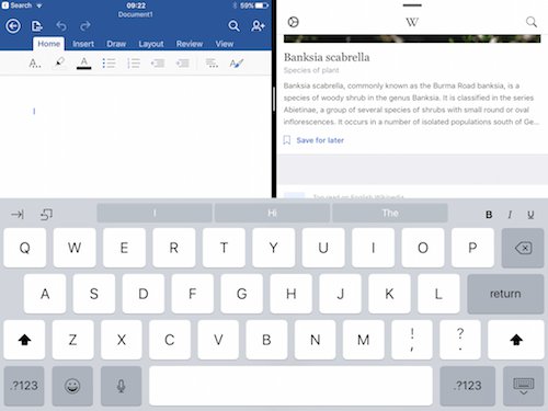 Split screen view can also be very helpful if you're referencing content from another app and need to be able to see it. In the example below, we've got Word open on the left and Wikipedia on the right, this way we can write a new document and see the Wikipedia article that we want to use at the same time.