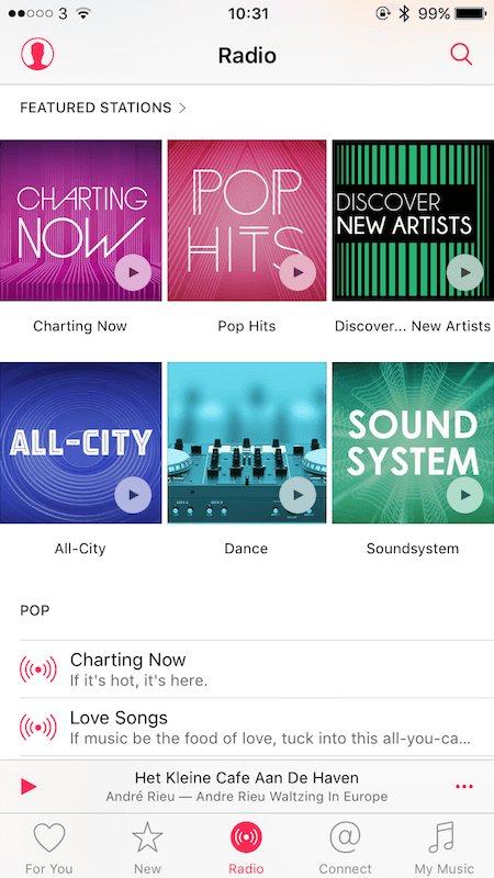 The Radio option allows you to listen to any of Apple's pre-defined radio stations, including their 24/7 Beats 1 radio. Radio stations in Apple Music play a particular genre of music depending on what station you pick, there are lots to choose from and it can save you having to decide for yourself what songs you want to play.