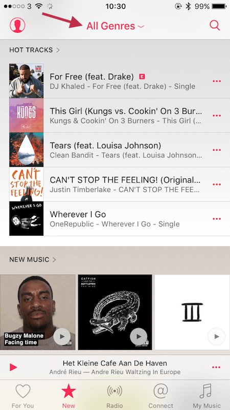 The New section shows you all the new music on Apple Music, starting with the most popular new music. You can use the Genres pop up list at the top to select a specific genre to look at, such as Classical or Pop.