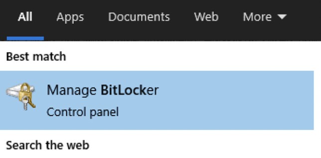The first step is to open the Manage BitLocker option in Control Panel, the easiest way to do this is to click on the Start button, type in BitLocker and then click on Manage BitLocker in the results.
