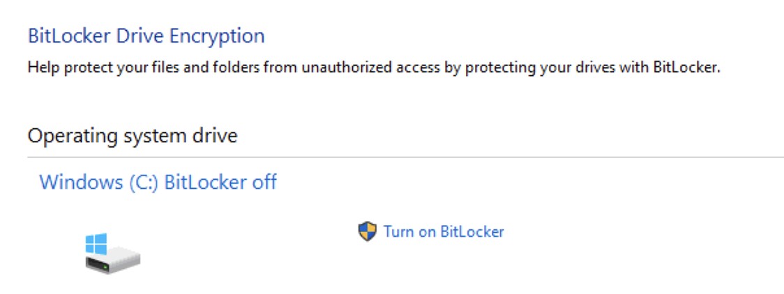 Once you open this, you should see the below window, all you need to do is click on Turn on BitLocker and then follow the steps to store your recovery details, just in case you ever forget your login password.
