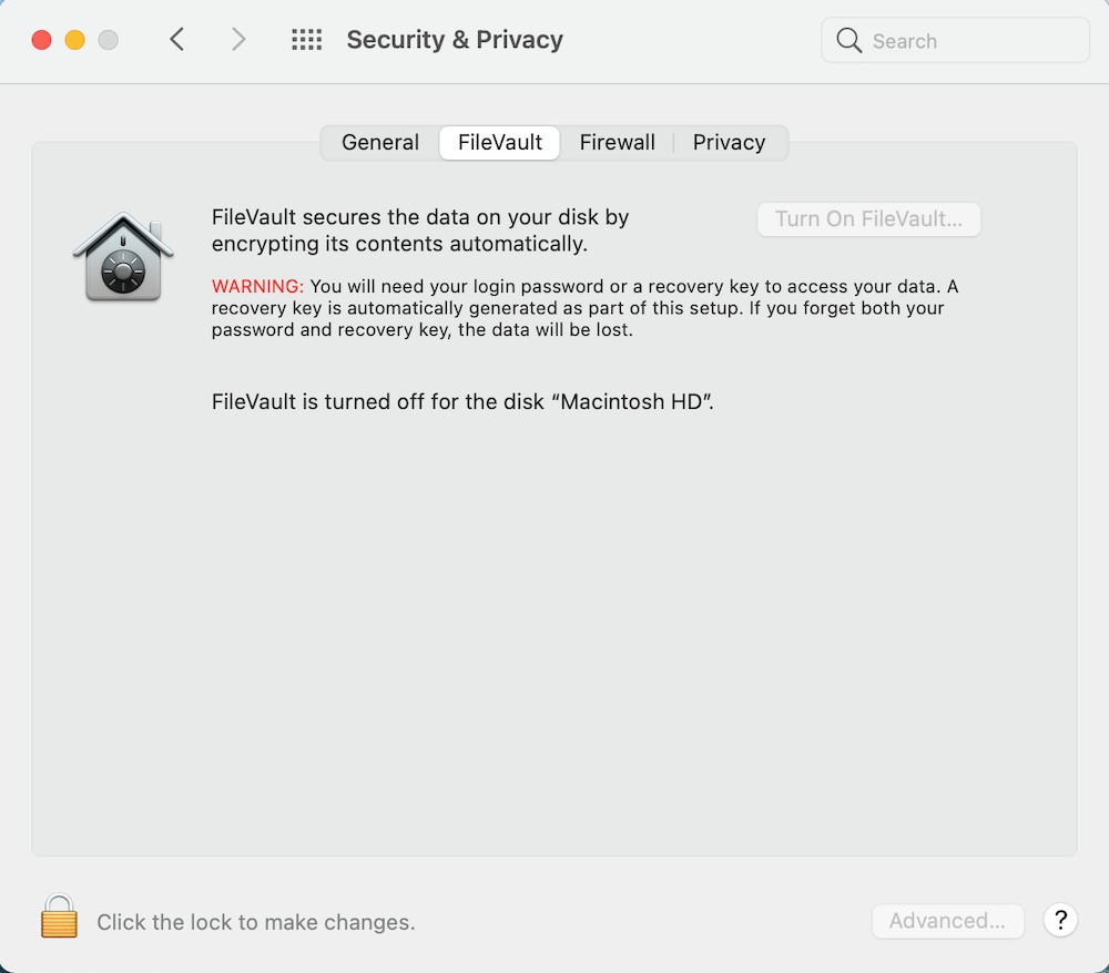 To set up FileVault, open System Preferences and click on the Security & Privacy icon and then click on the FileVault tab across the top of that window. If the Turn On FileVault button is greyed out as it is here, then you just need to click on the padlock at the bottom right of the window and authenticate with your login password.