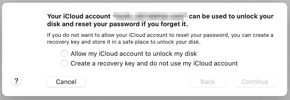 Once you've clicked on Turn On FileVault , you'll see the below message telling you that you can use your iCloud account as a recovery key in case you forget your password. As long as your iCloud account is protected with a strong password and maybe even has 2FA set up, you can use iCloud as a recovery option.