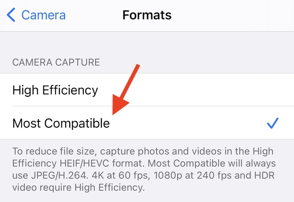 Now you just need to tap on Most Compatible and this will set your photo and video formats back to more standard files which you'll be able to open on any PC